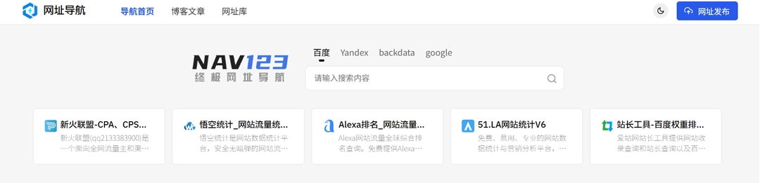 在导航首页头部区域提供了一个简单的聚合搜索功能。聚合搜索功能可以把各搜索引擎的搜索链接汇集在一起,用户可以便捷的选择搜索引擎进行搜索。